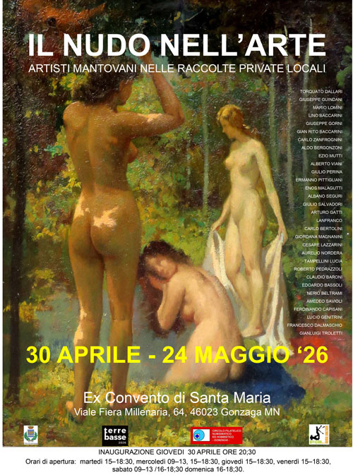 Giovedì 30 aprile alle ore 20,30 presso l’ex Convento di Santa Maria a Gonzaga, verrà inaugurata la mostra: IL NUDO NELL’ARTE artisti mantovani nelle raccolte private locali, nell’ambito dell’iniziativa culturale TERRE BASSE, seguirà alle ore 21,15 la presentazione già programmata sul tema il nudo a Mantova a cura di Ferdinando Capisani. La mostra rimarrà aperta fino al 24 maggio 2026 con i seguenti orari: martedì 15–18:30, merco- ledì 09–13, 15–18:30, giovedì 15–18:30, venerdì 15–18:30, sabato 09–13 /16-18;30 domenica 16-18;30.
